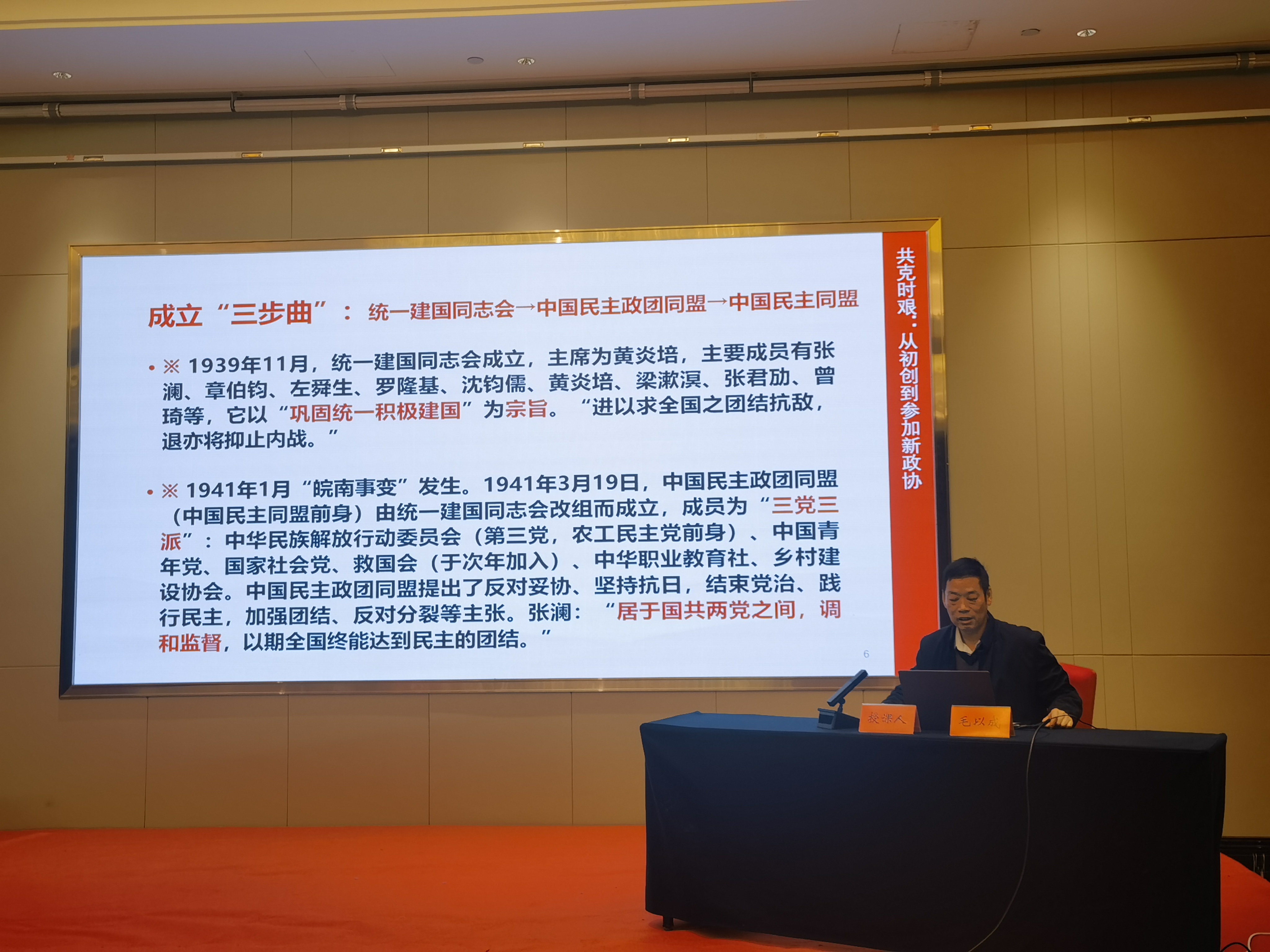 会上,毛以成主委围绕“共克时艰、共历风雨、共襄伟业、政治交接”等四个方面为大家讲解民盟盟史。他强调,新盟员要以此次培训为新起点,一要坚定政治立场,贯彻落实中共二十届四中全会精神,增进对中国特色社会主义的认同,与党中央保持高度一致。二要强化理论武装,认真学习民盟历史与传统,从专题片和老盟员经验中汲取力量、感悟担当,提升政治素养与理论水平。三要积极履职尽责,立足岗位发挥优势,围绕“十五五”规划积极调研建言,为安庆发展和民盟事业献智出力。随后,四位主委为新盟员颁发入盟通知书和盟员证,新老盟员依次作自我介绍。